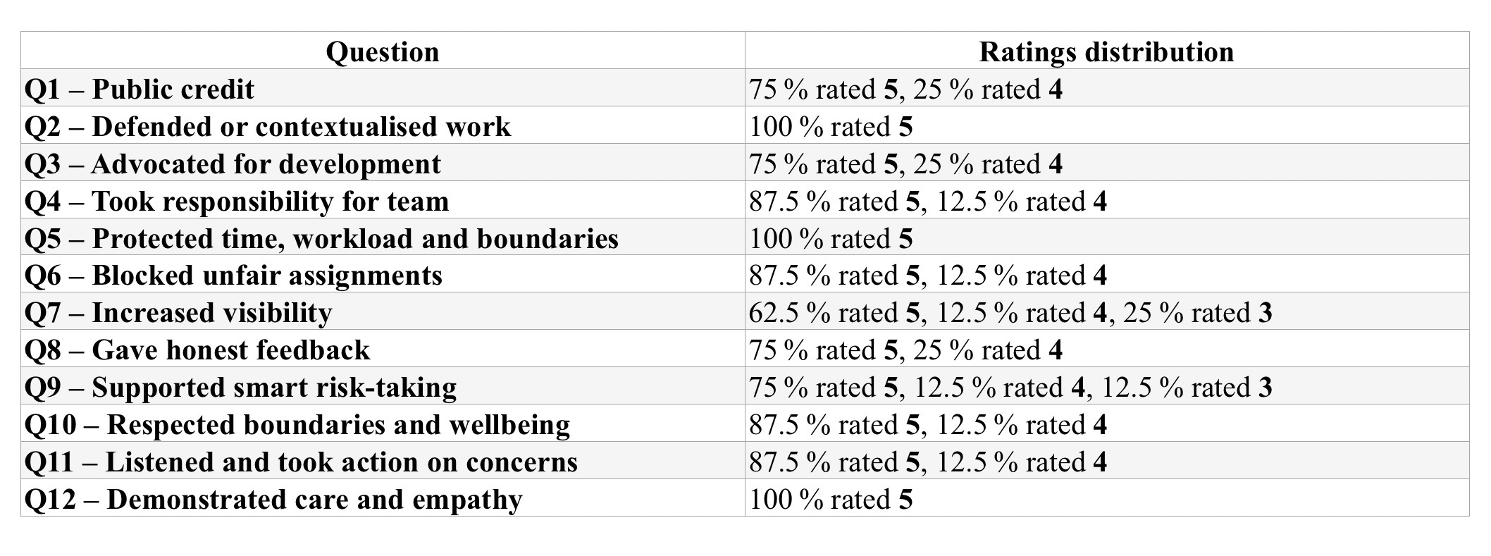 The table below shows the proportion of ratings for each of the 12 scaled questions. Across most questions, the majority of responses were 5 (Strongly Agree), with occasional 4s and a few 3s. There were no ratings of 1 or 2.