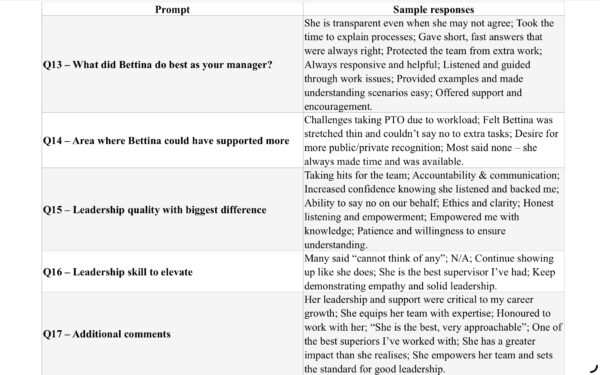 The dominant themes were Bettina’s accountability, communication, and willingness to take hits for the team. Participants appreciated her honesty, ethical approach and empowerment to build confidence. She listens carefully, empowers people with knowledge and ensures they fully understand situations before moving forward.