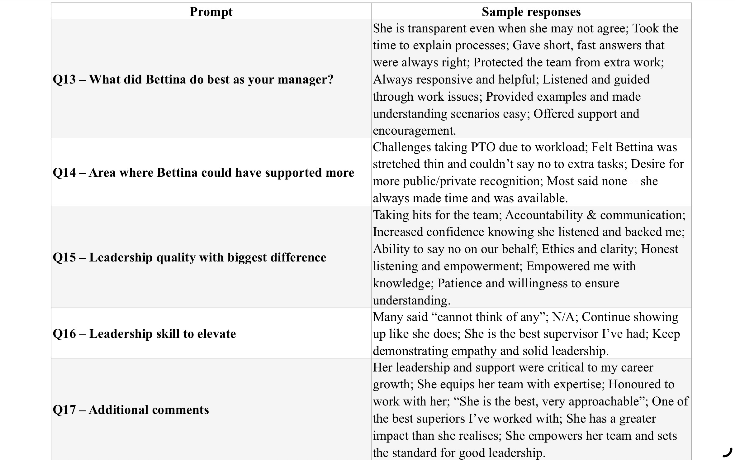 Q13 – What did Bettina do best as your manager?